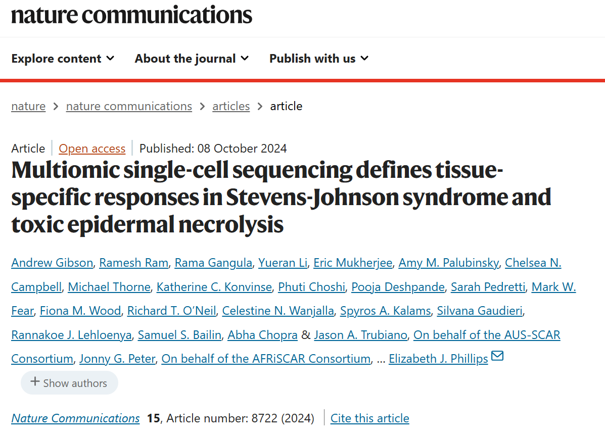 1. Gibson A, Ram R, Gangula R, Li Y, Mukherjee E, Palubinsky AM, Campbell CN, Thorne M, Konvinse KC, Choshi P, Deshpande P, Pedretti S, Fear MW, Wood FM, O’Neil RT, Wanjalla CN, Kalams SA, Gaudieri S, Lehloenya RJ, Bailin SS, Chopra A, Trubiano JA; AUS-SCAR Consortium; Peter JG; AFRiSCAR Consortium; Mallal SA, Phillips EJ. Multiomic single-cell sequencing defines tissue-specific responses in Stevens-Johnson syndrome and toxic epidermal necrolysis. Nat Commun 15, 8722 (2024). https://doi.org/10.1038/s41467-024-52990-3